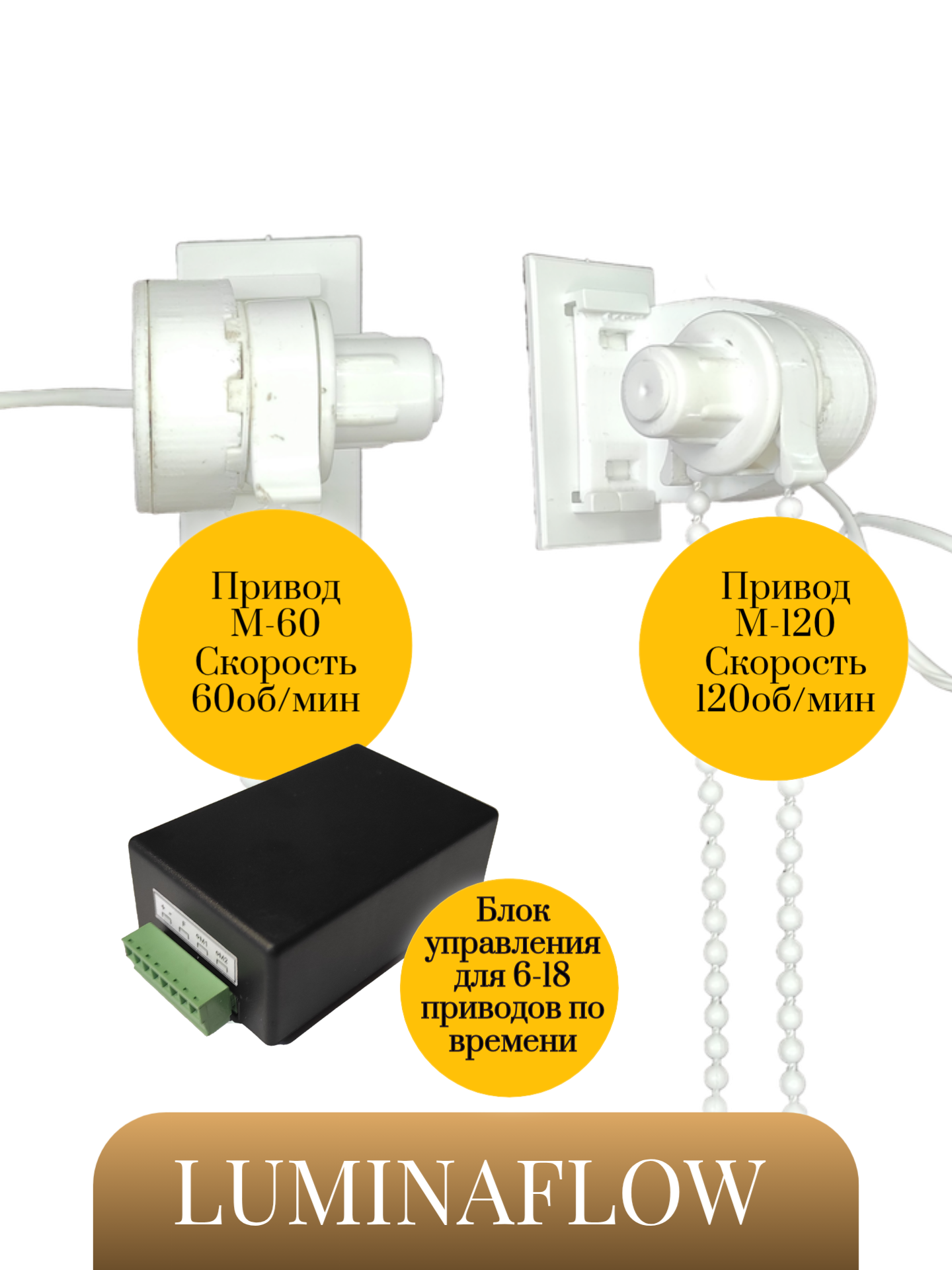 В комплектацию входят сам контроллер и различные приводы. Все элементы продаются отдельно. Привод М60 для рулонных мини штор и штор в режиме день-ночь скорость оборотов 60об/мин. Привод М120 для рулонных мини штор и штор в режиме день-ночь скорость оборотов 120об/мин. Привод для вертикальных жалюзи - открытие жалюзи в режиме день-ночь.